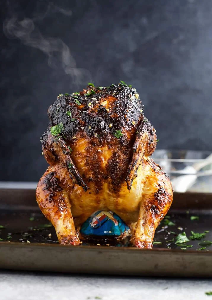 Gently set the chicken on top of the can of beer. The can will go into the cavity of the chicken so it looks like it’s sitting down.