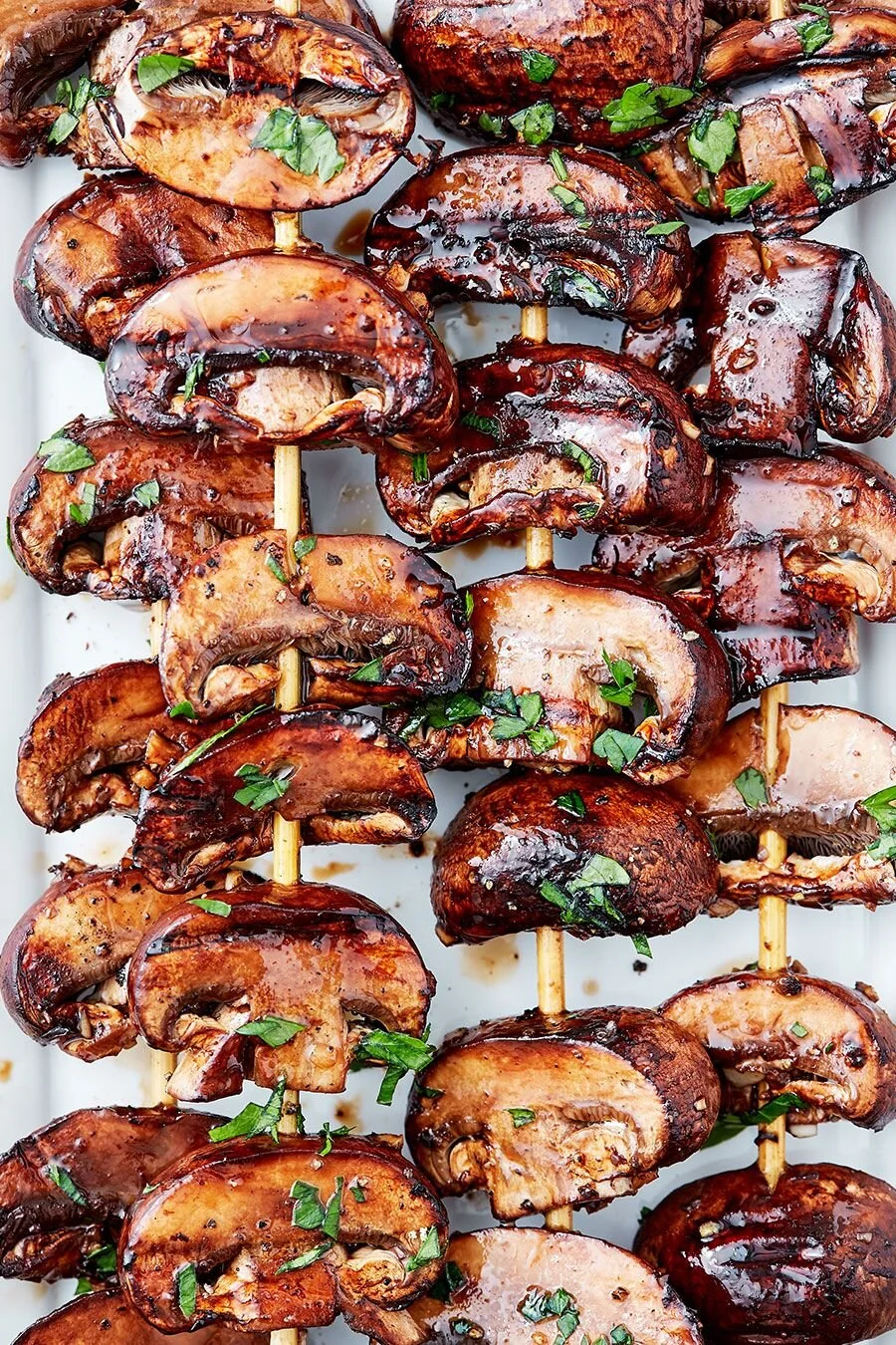Heat grill to medium-high. Skewer mushrooms and grill 2 to 3 minutes per side.