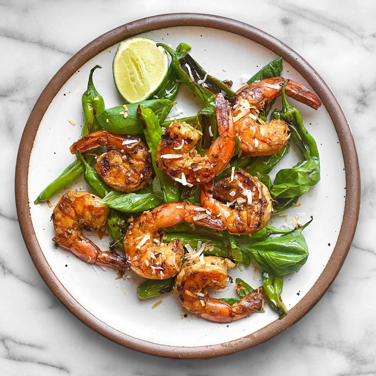 Top shrimp and peppers with basil, drizzle with lime juice, and sprinkle with sea salt and more coconut.
