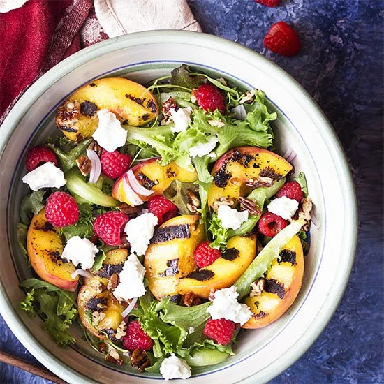 Fill a serving bowl with the mixed greens. Add the raspberries, red onion, and grilled peaches.