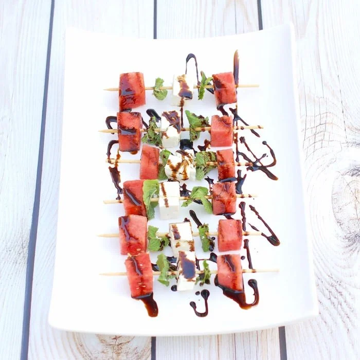Grilled Watermelon, Mint and Feta Skewers with Balsamic Dressing