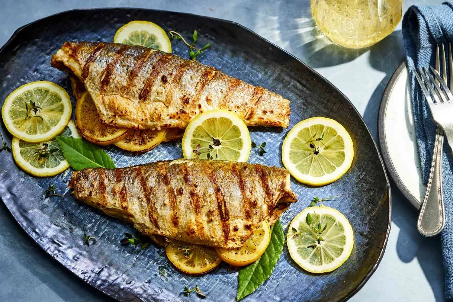 Light a grill or preheat a grill pan. Season the fish cavities with salt and pepper. Stuff each cavity with a thyme sprig, a bay leaf, and 2 lemon slices. Rub the outside of the branzino with the olive oil and season with salt and pepper.
