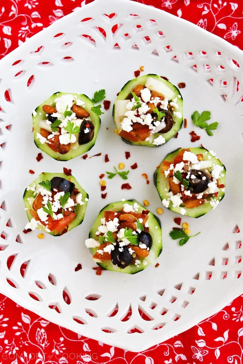 Scoop about 1 tablespoon of the Mediterranean salad into the cucumber cups. Garnish with additional parsley and feta, if desired.